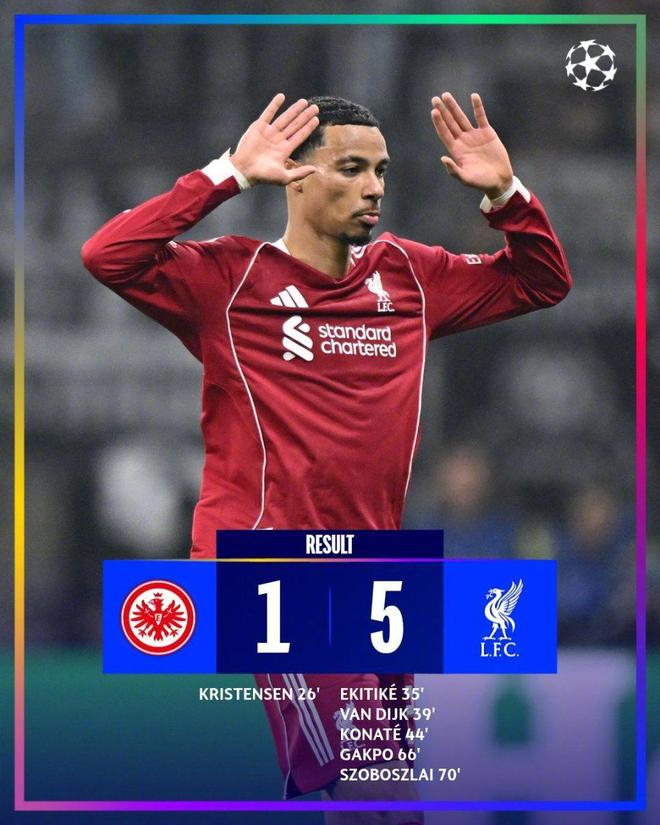 第26分鐘克里斯滕森小角度射門得手,主隊(duì)法蘭克福取得領(lǐng)先。第35分鐘?;倏嗣鎸?duì)舊主單刀破門,利物浦追平比分。范戴克和科納特又先后取得進(jìn)球,半場(chǎng)利物浦3-1領(lǐng)先。第66分鐘加克波門前包抄破門,利物浦將比分改寫(xiě)為4-1。第70分鐘索博斯洛伊轟出世界波,比分定格在5-1。